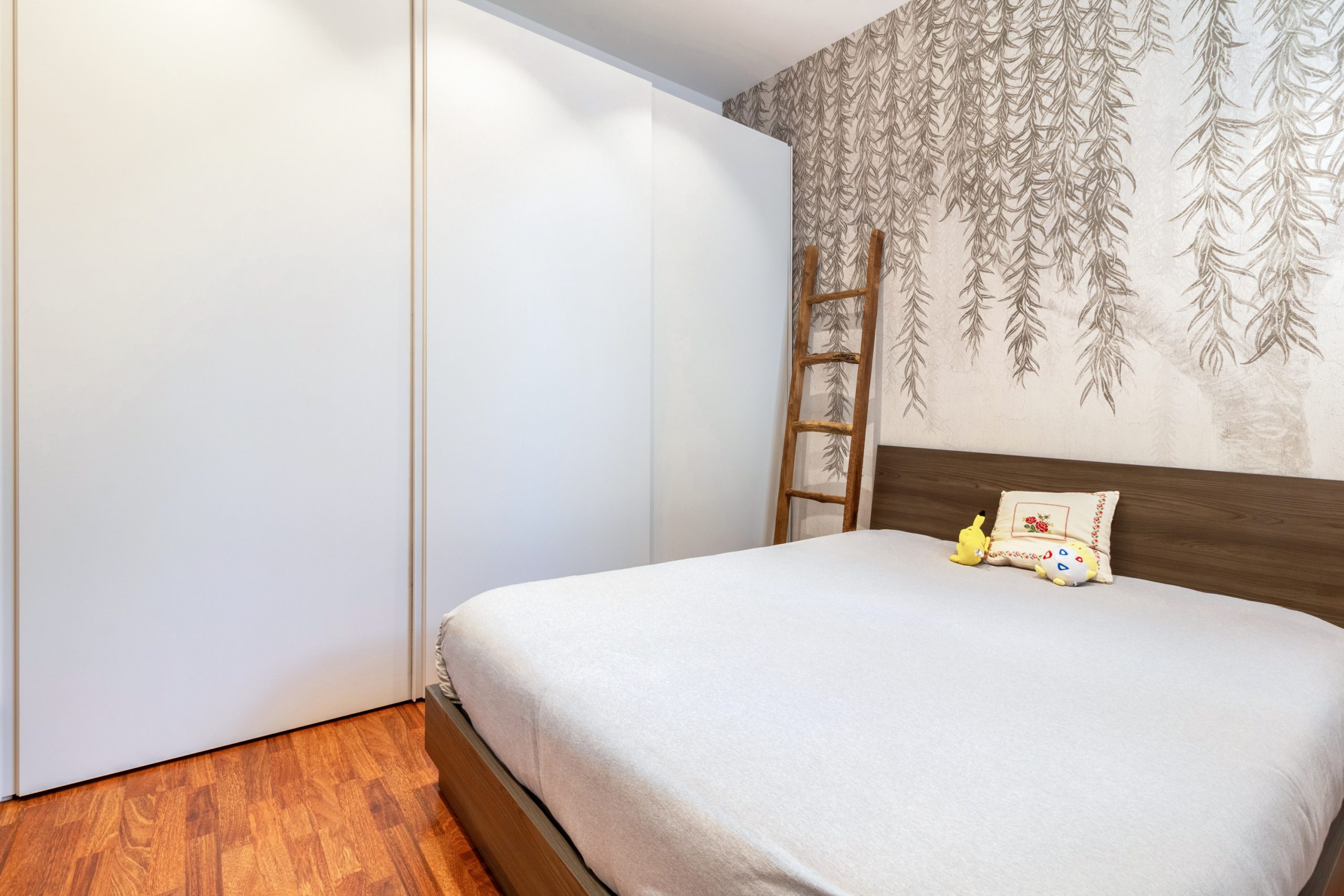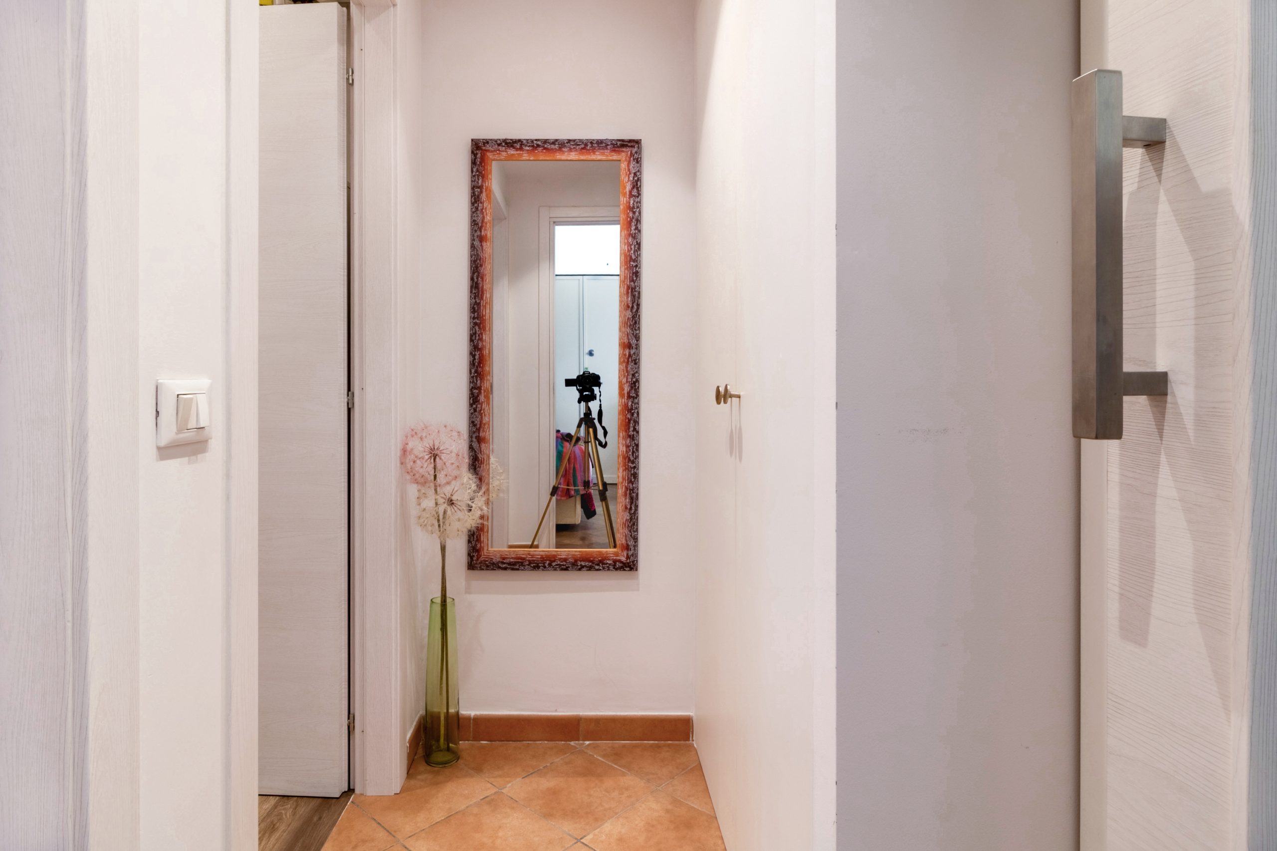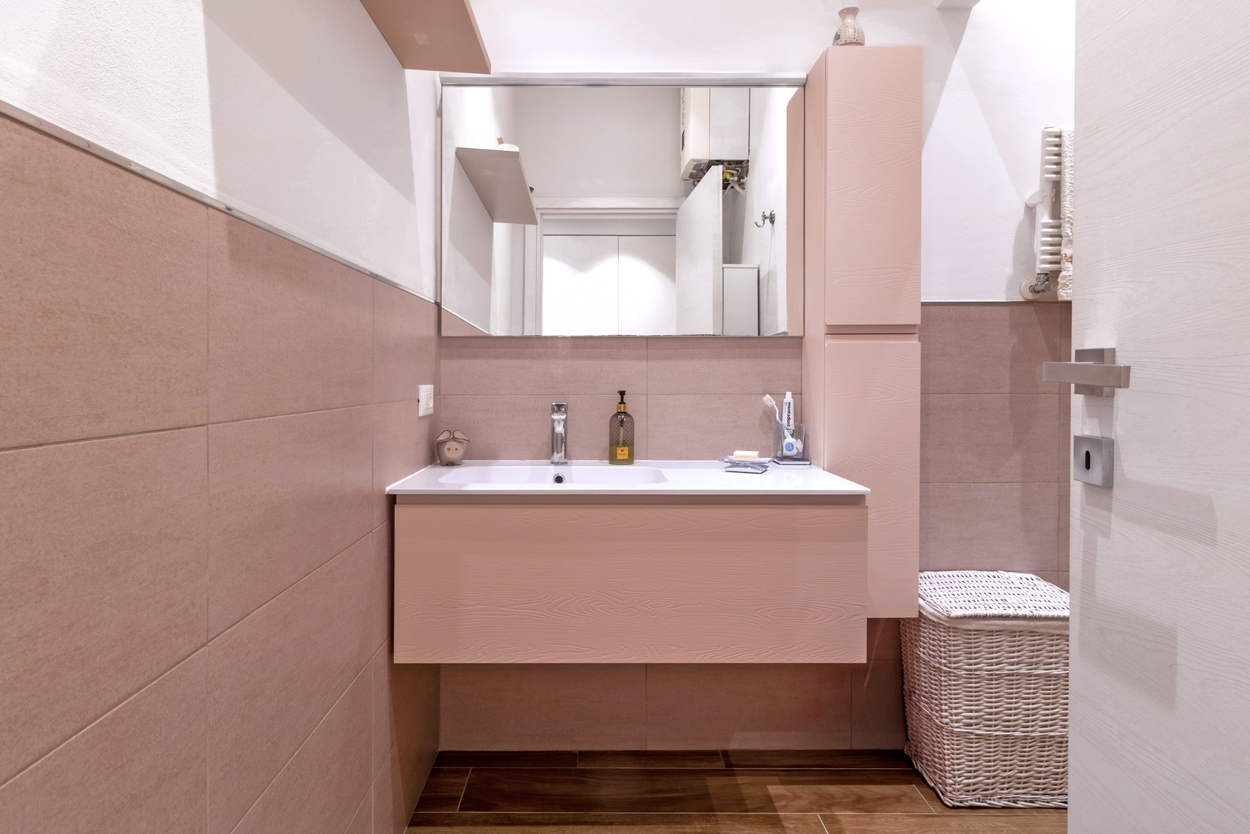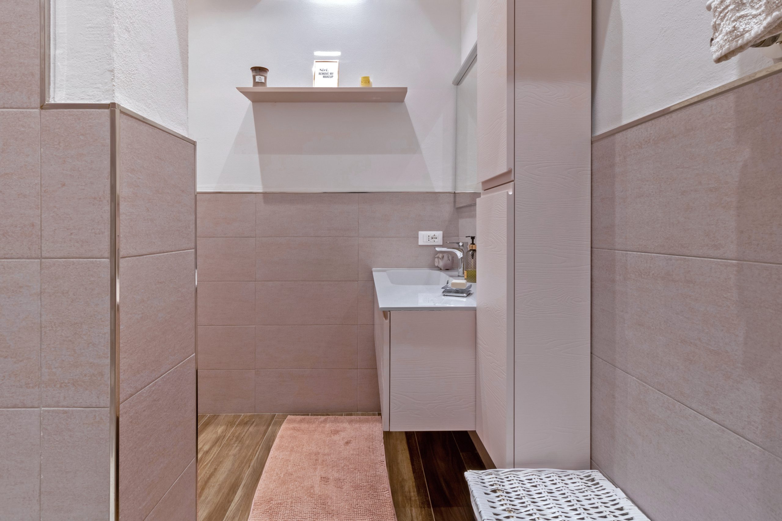 Oltre una elegante porta con inserti in vetro, la casa svela il suo lato più intimo: un disimpegno curato nei minimi dettagli ospita armadiature su misura, riservate e silenziose, che custodiscono con discrezione la lavanderia e il ripostiglio, lasciando che intorno regni solo l’armonia.