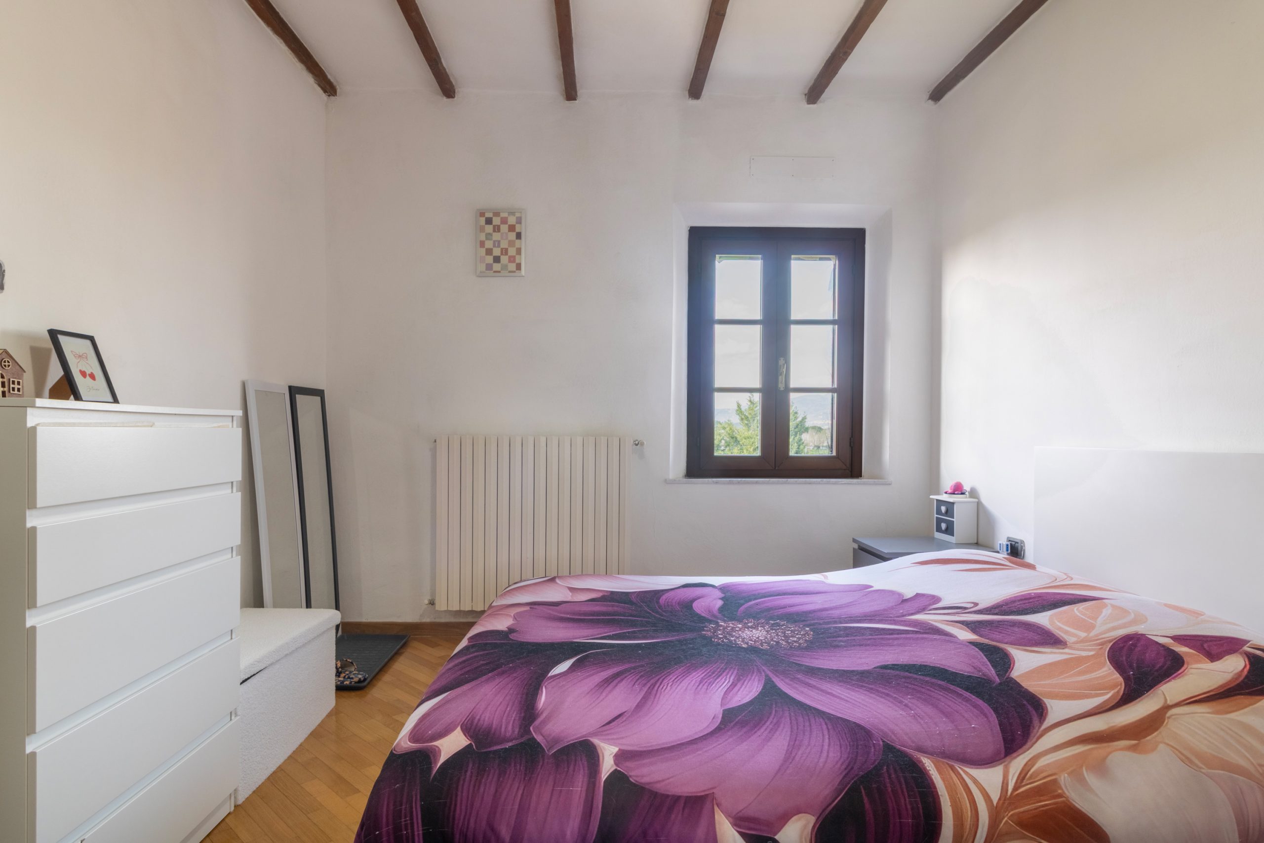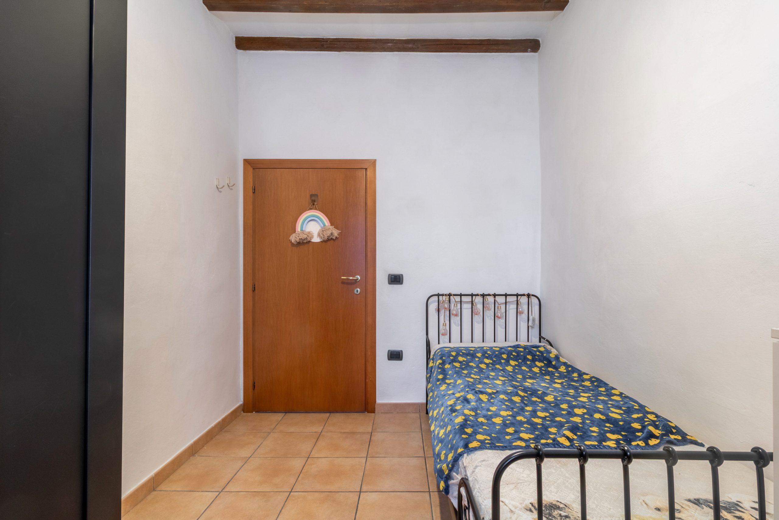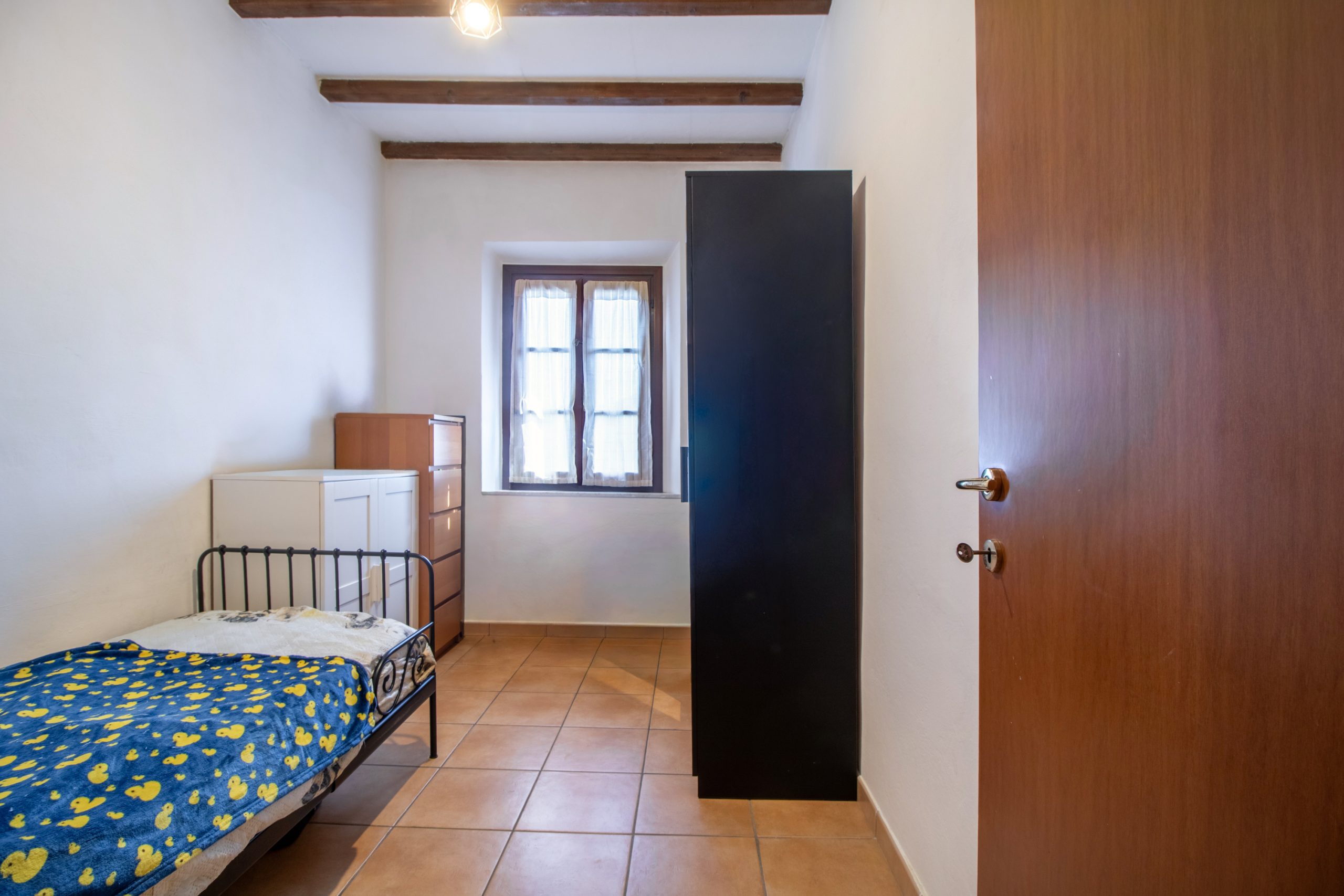 Un piccolo disimpegno separa la zona giorno dalla parte più intima della casa, dove si trovano una camera matrimoniale luminosa e un bagno finestrato con doccia.