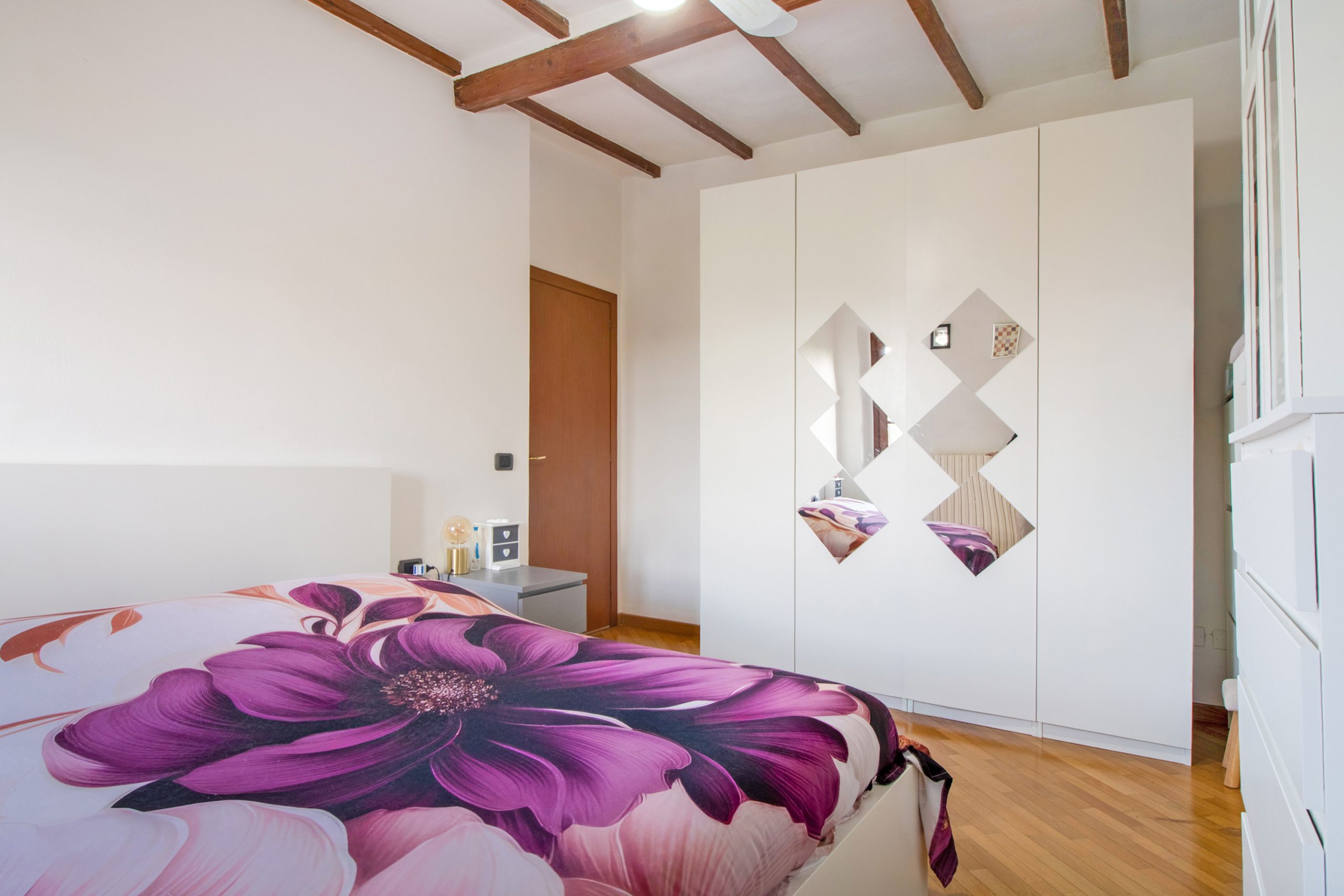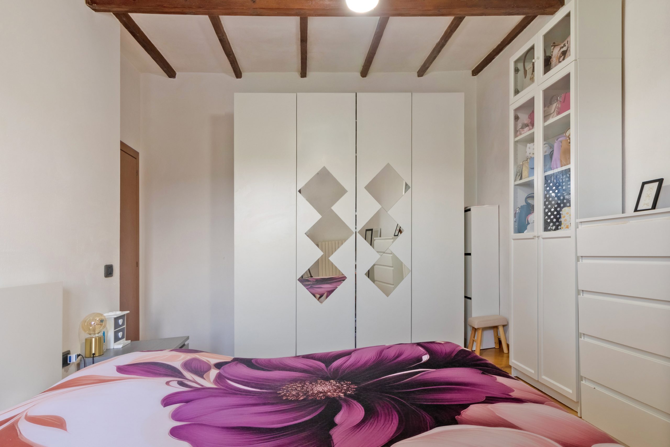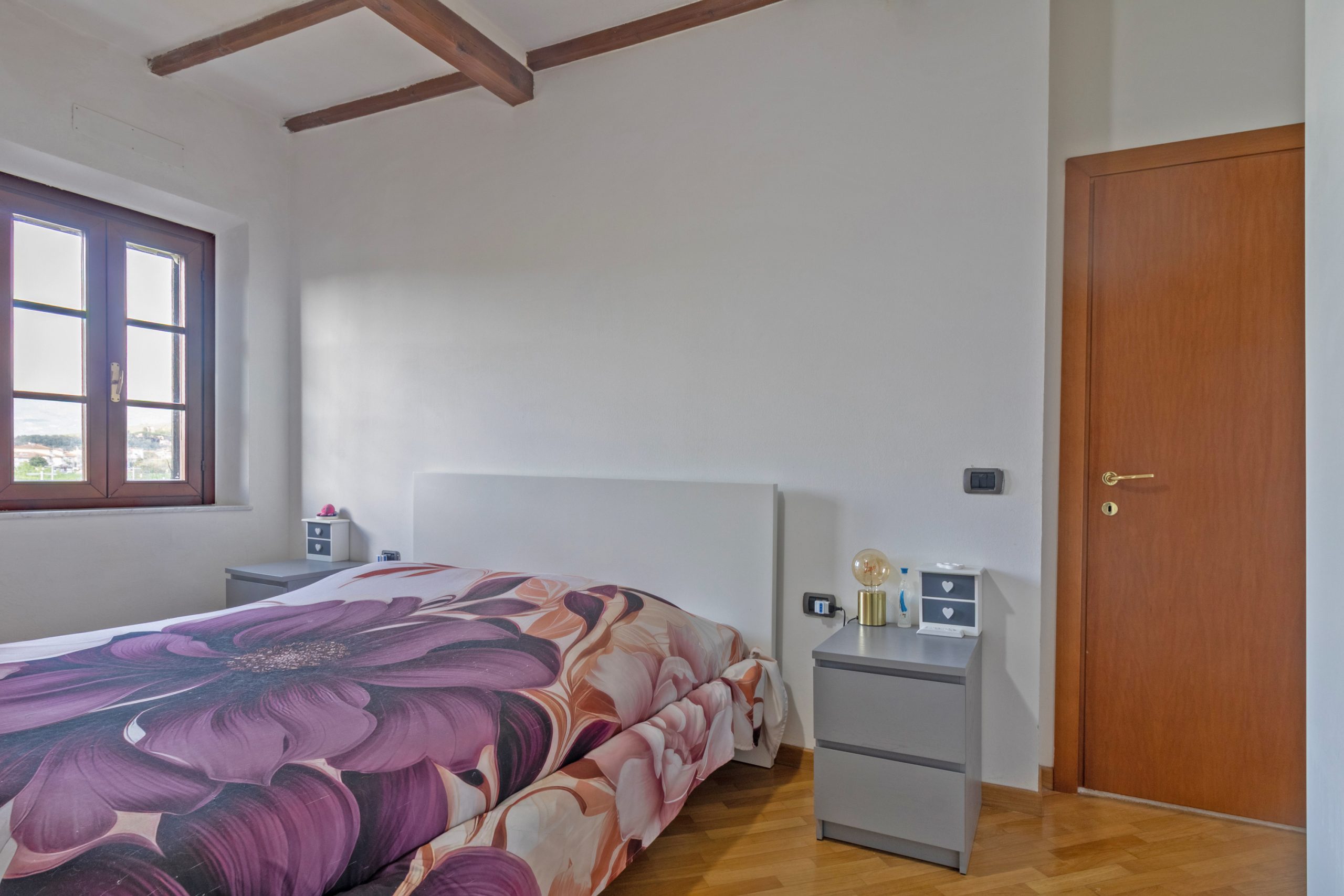 Un piccolo disimpegno separa la zona giorno dalla parte più intima della casa, dove si trovano una camera matrimoniale luminosa e un bagno finestrato con doccia.